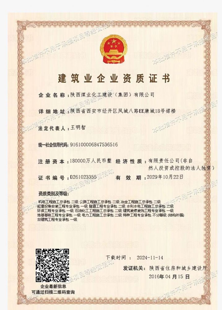 擁有建筑工程施工總承包、礦山工程施工總承包“雙特級”資質(zhì)和建筑行業(yè)甲級、煤炭行業(yè)(礦井、選煤廠)專業(yè)甲級設計資質(zhì);市政公用工程、鋼結(jié)構(gòu)工程、起重設備安裝工程、環(huán)保工程、建筑裝修裝飾工程、地基基礎工程、古建筑工程一級承包資質(zhì);機電工程、公路工程、冶金工程、鐵路工程、水利水電工程、石油化工工程、電力工程、隧道工程二級承包資質(zhì),同時具有特種工程專業(yè)承包資質(zhì)。